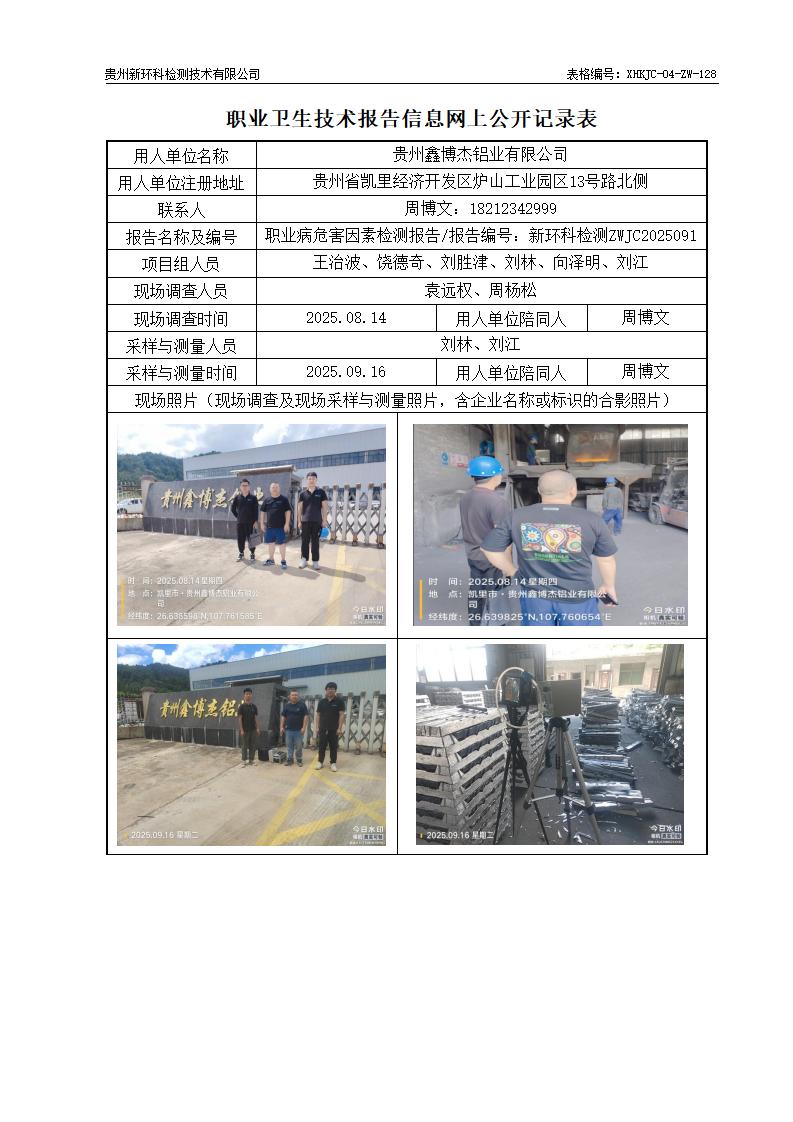 贵州鑫博杰铝业有限公司职业病危害因素检测公示