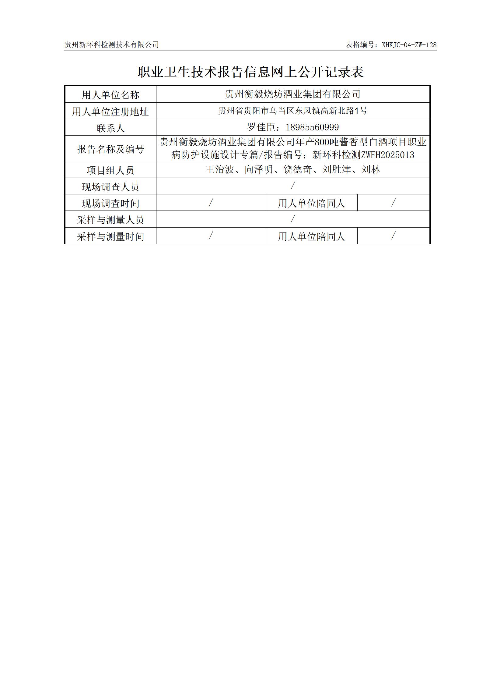 贵州衡毅烧坊酒业集团有限公司年产800吨酱香型白酒项目职业病防护设施设计专篇公示