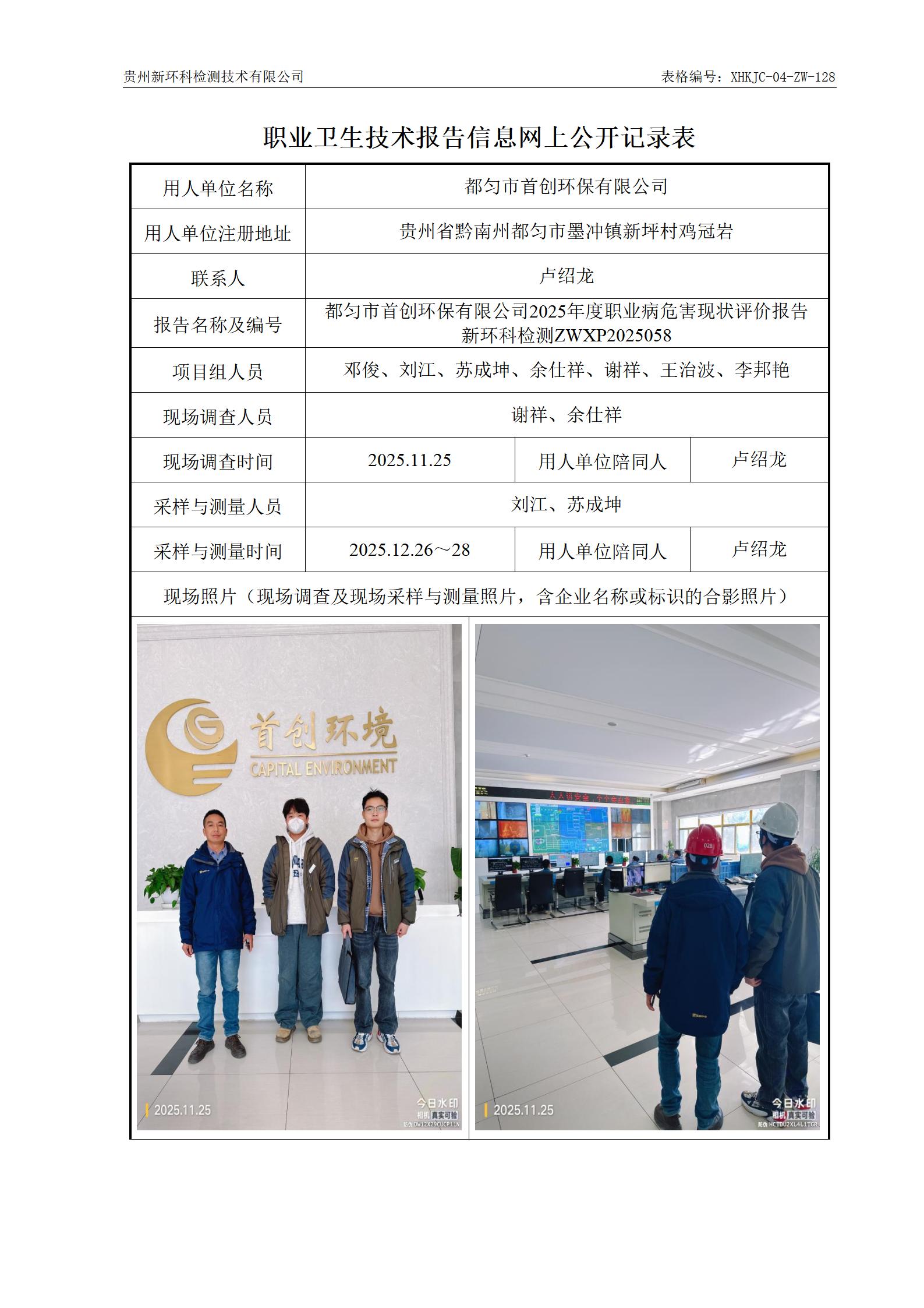 都匀市首创环保有限公司2025年度职业病危害现状评价公示