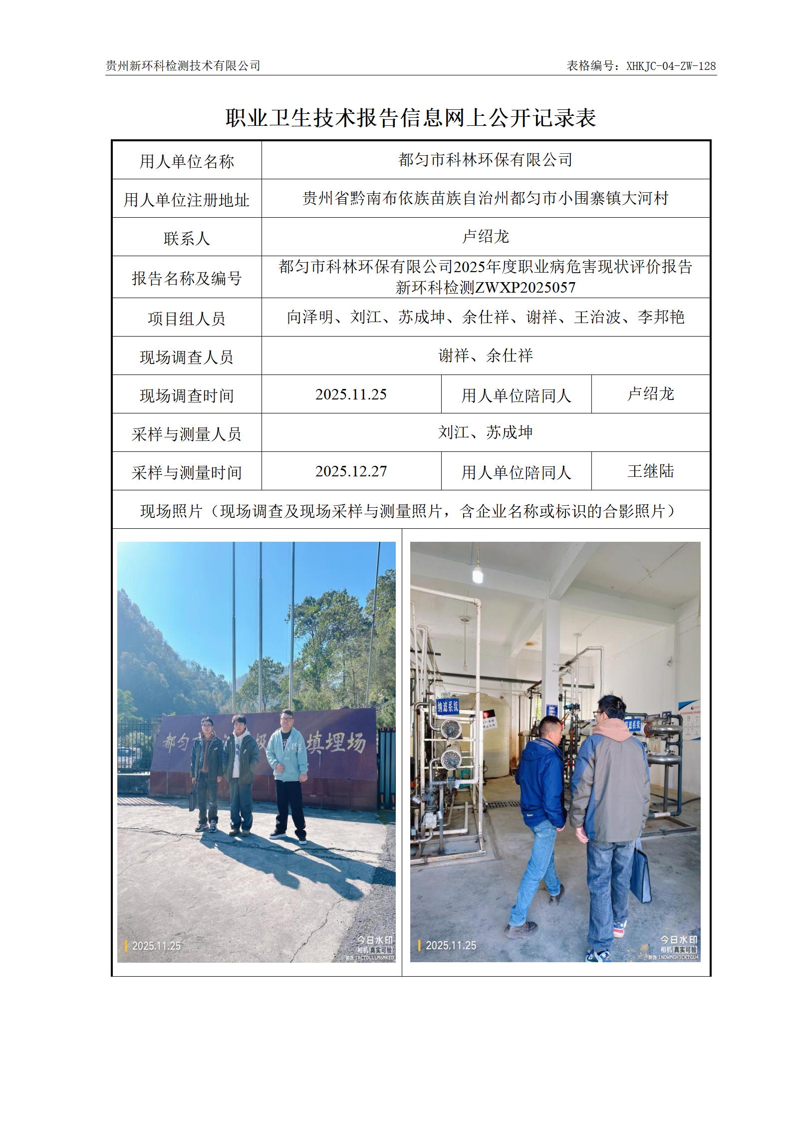 都匀市科林环保有限公司2025年度职业病危害现状评价公示