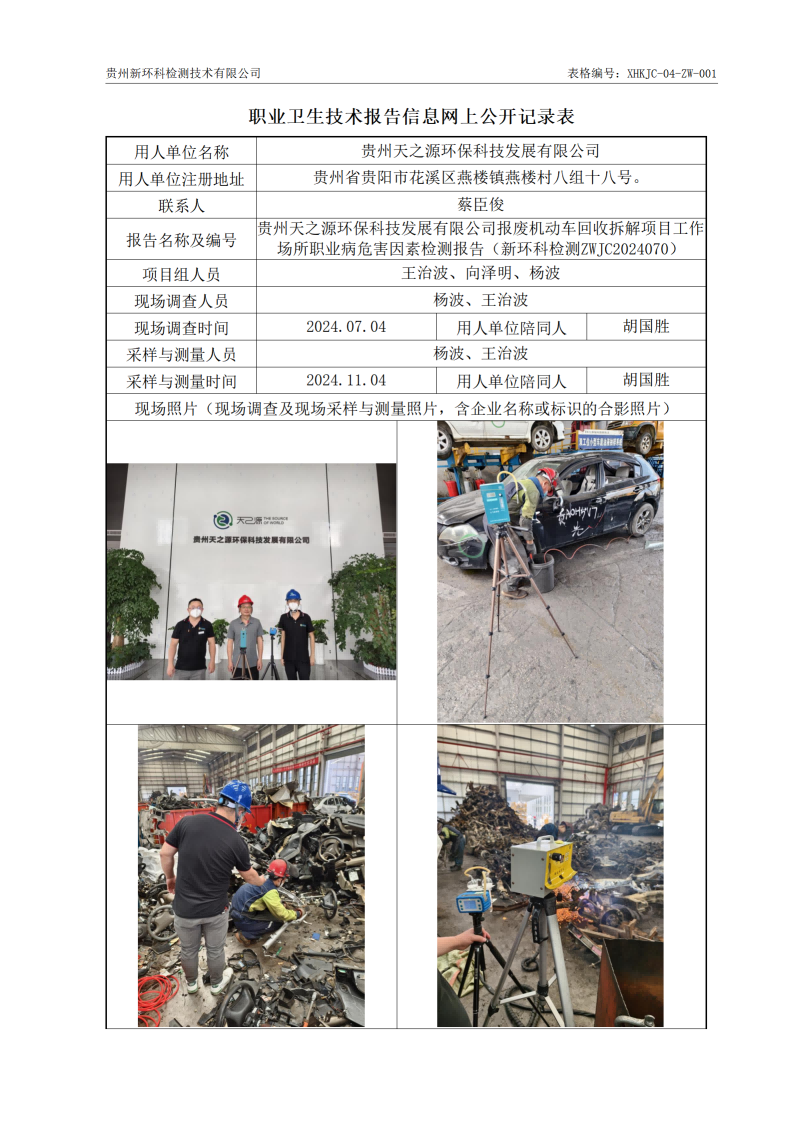 贵州天之源环保科技发展有限公司报废机动车回收拆解项目工作场所职业病危害因素检测公示
