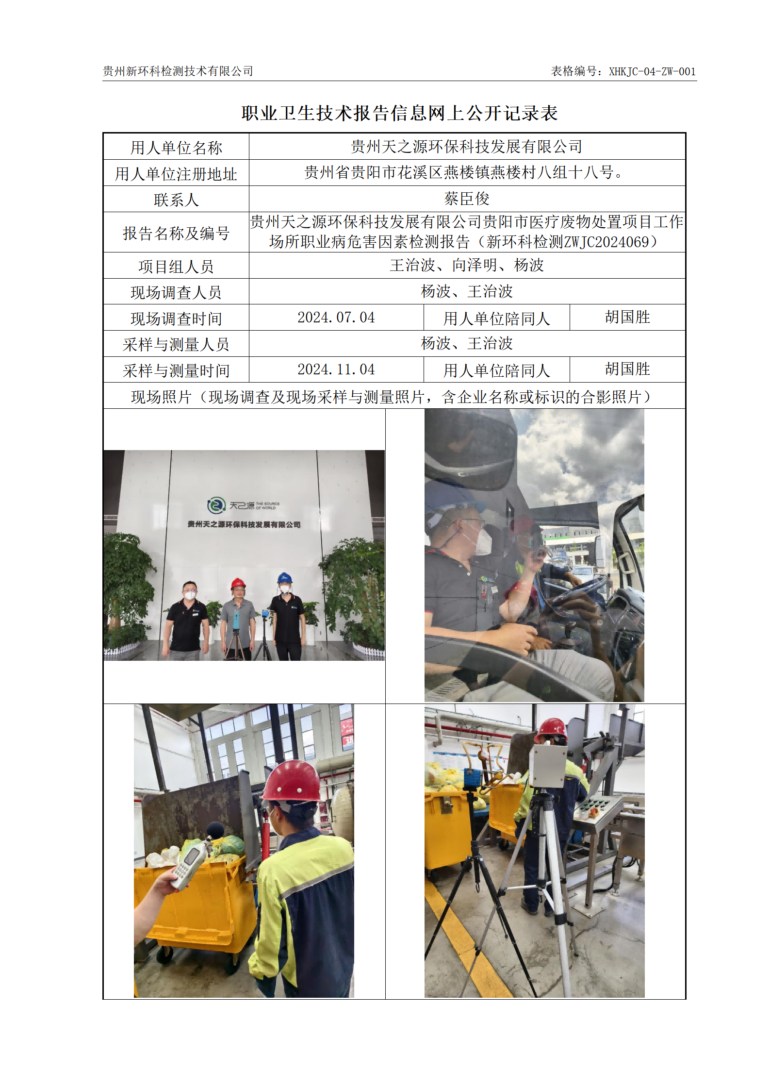 贵州天之源环保科技发展有限公司贵阳市医疗废物处置项目工作场所职业病危害因素检测公示