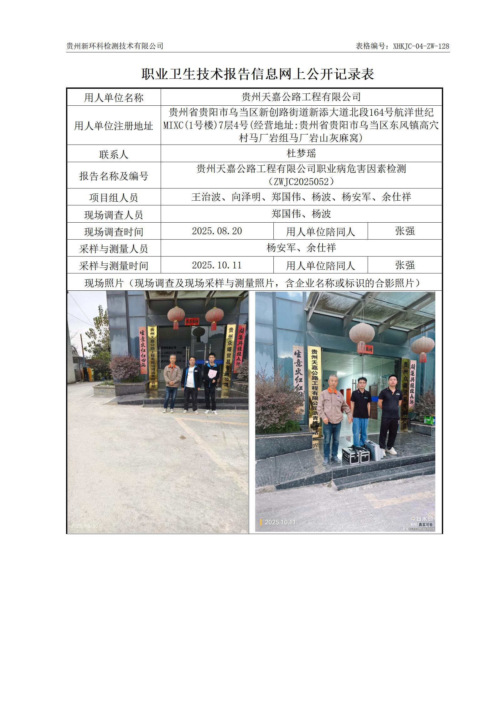 贵州天嘉公路工程有限公司职业病危害因素检测公示