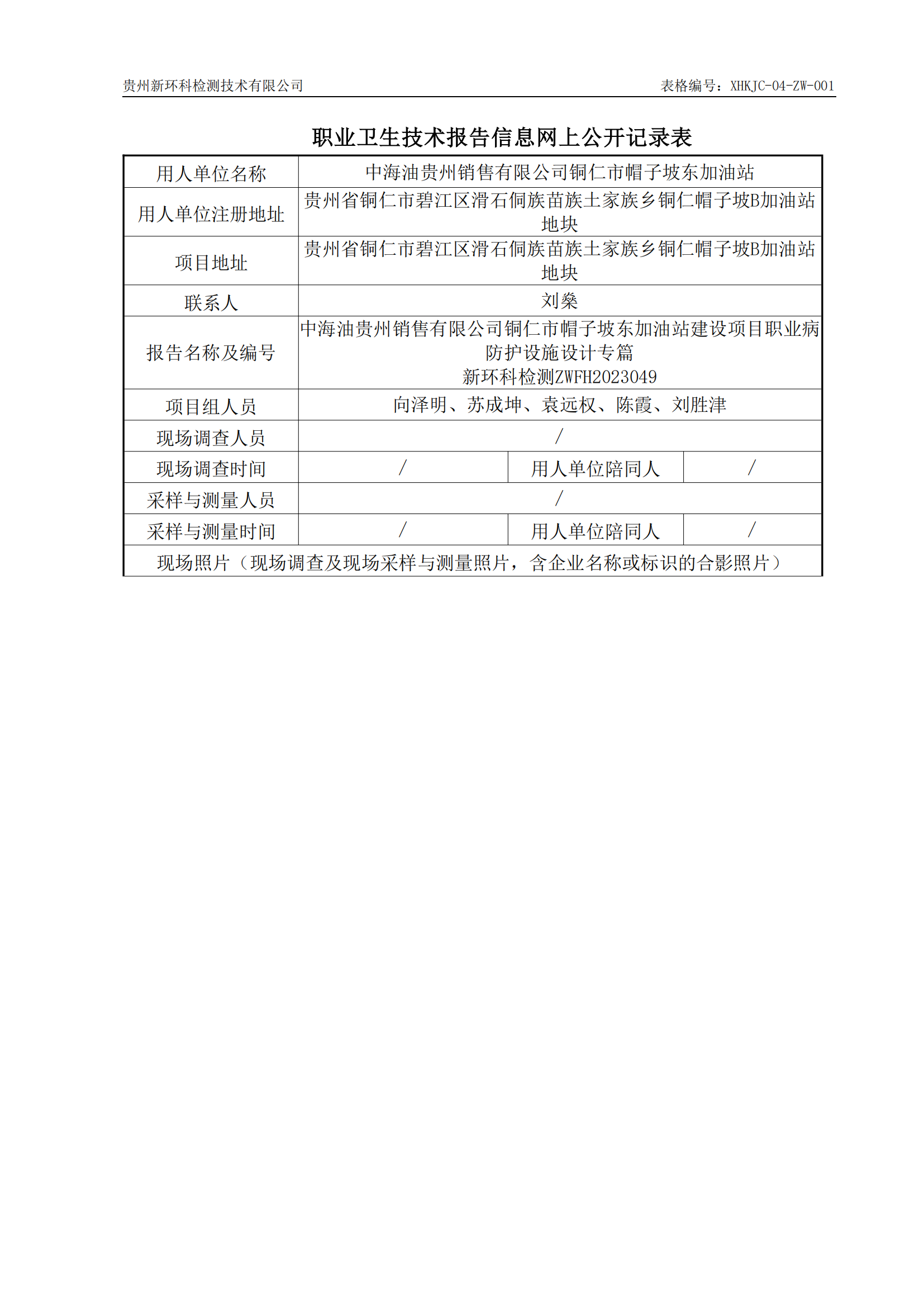 中海油贵州销售有限公司铜仁市帽子坡东加油站建设项目职业病 防护设施设计专篇公示
