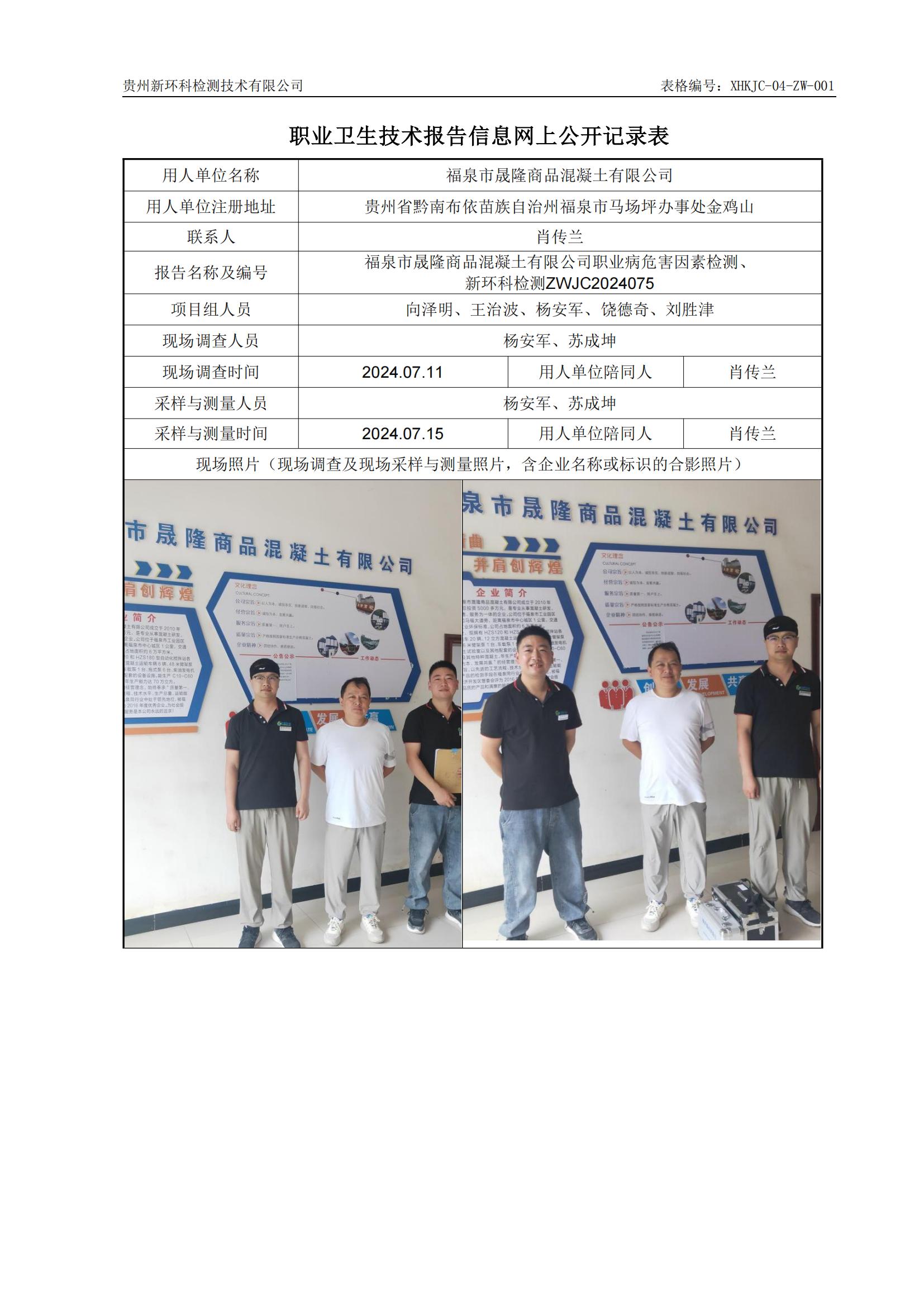 福泉市晟隆商品混凝土有限公司职业病危害因素检测公示