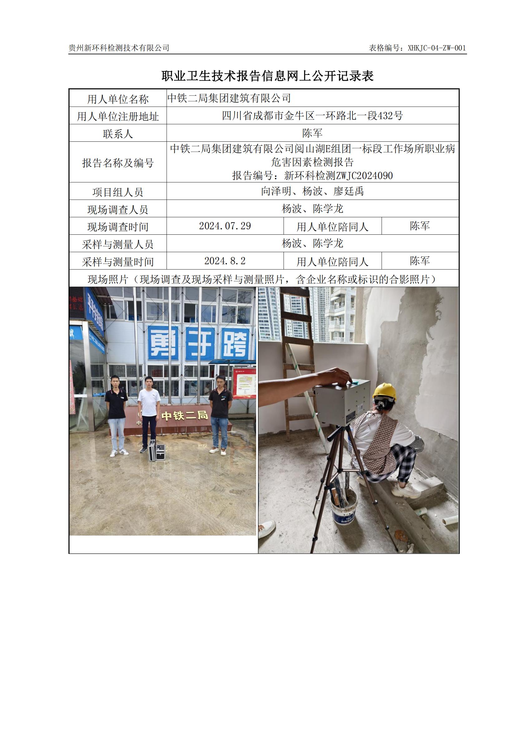 中铁二局集团建筑有限公司阅山湖E组团一标段工作场所职业病危害因素检测公示