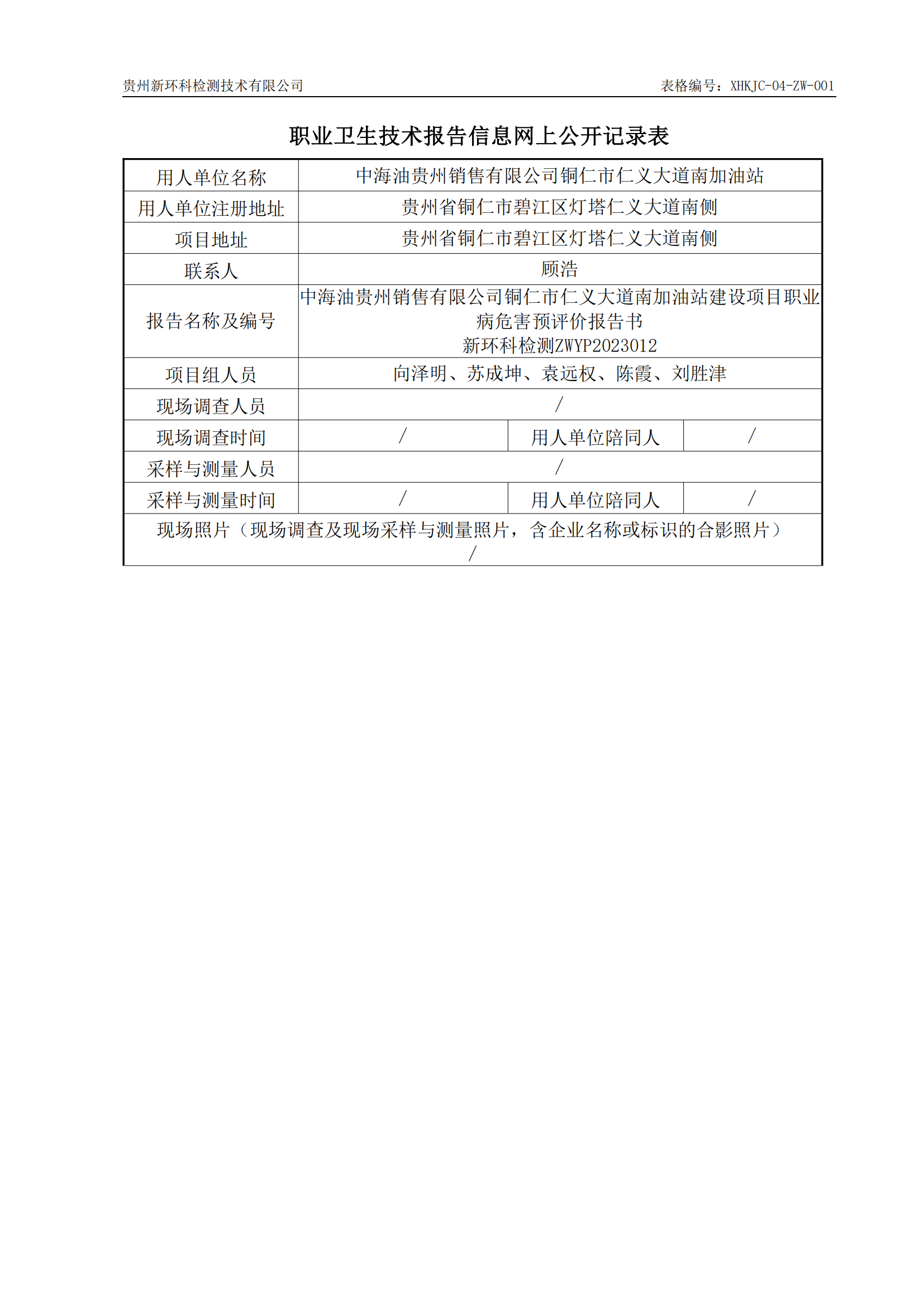 中海油贵州销售有限公司铜仁市仁义大道南加油站建设项目职业病危害预评价公示