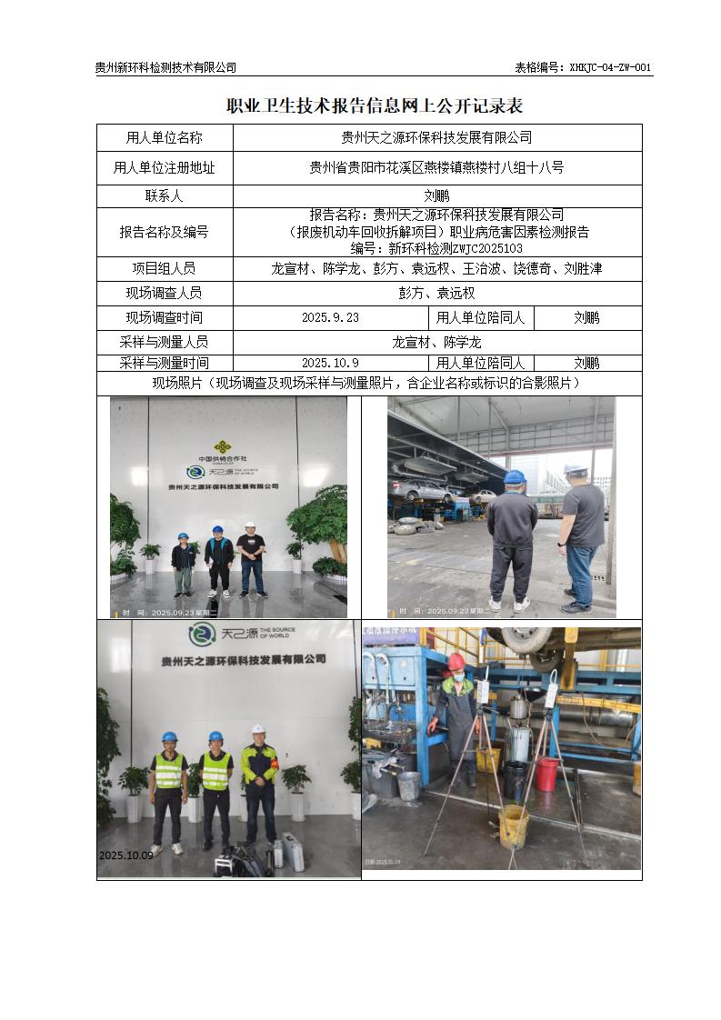 贵州天之源环保科技发展有限公司 (报废机动车回收拆解项目)职业病危害因素检测公示