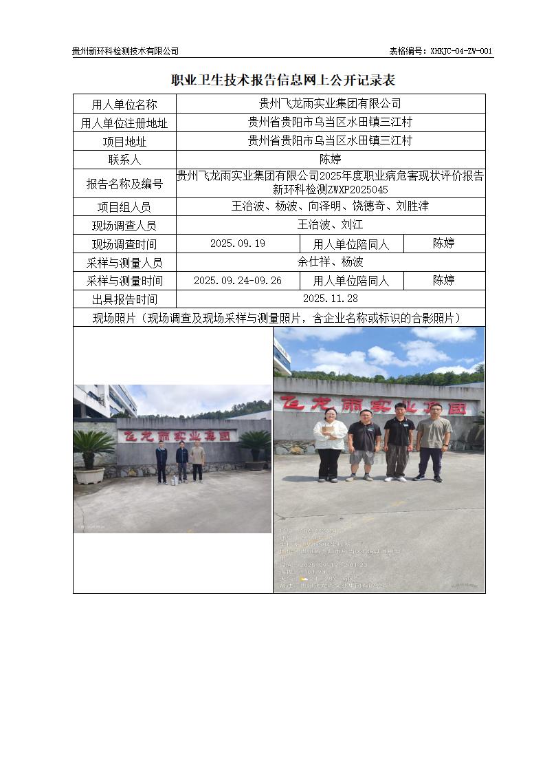 贵州飞龙雨实业集团有限公司2025年度职业病危害现状评价公示
