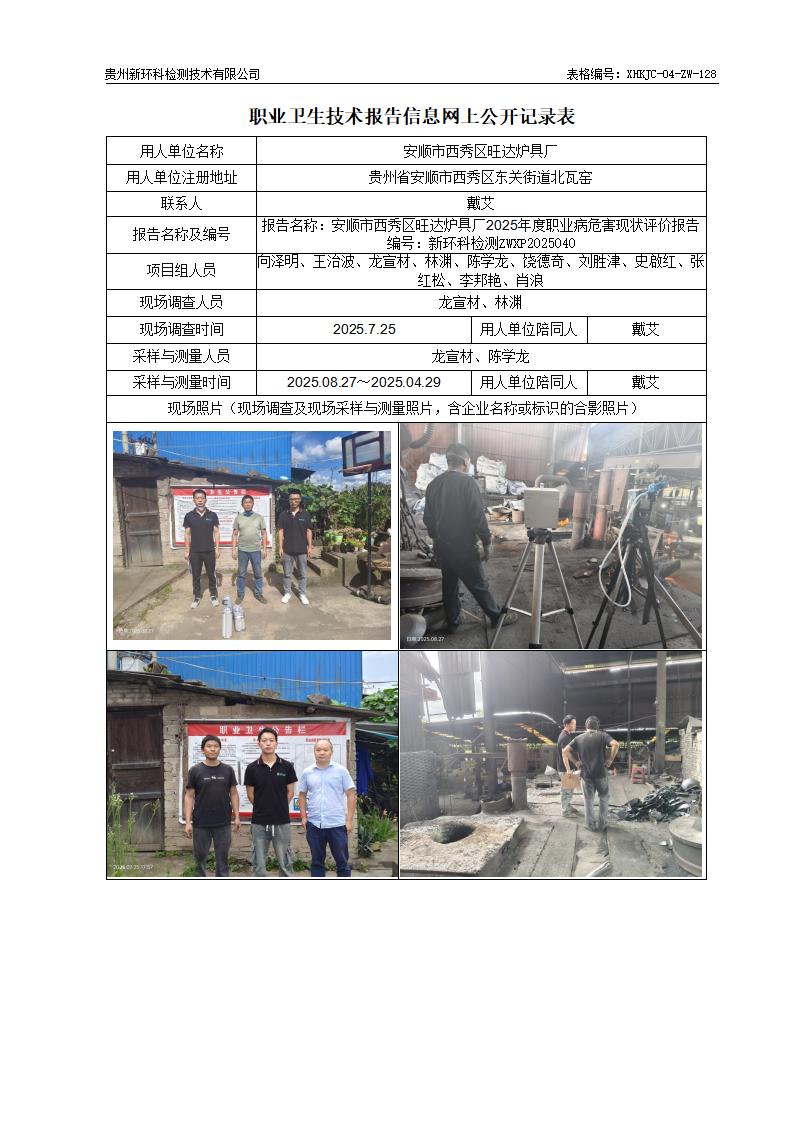 安顺市西秀区旺达炉具厂2025年度职业病危害现状评价公示
