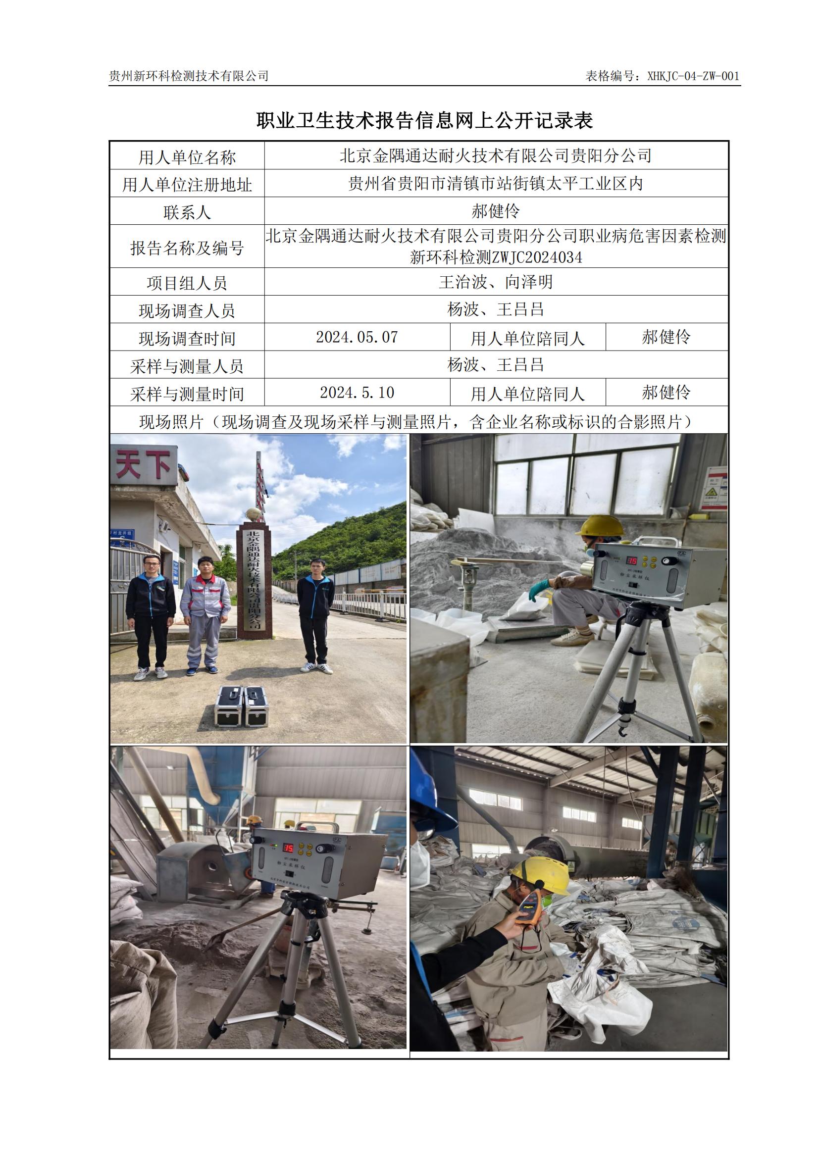 北京金隅通达耐火技术有限公司贵阳分公司职业病危害因素检测公示
