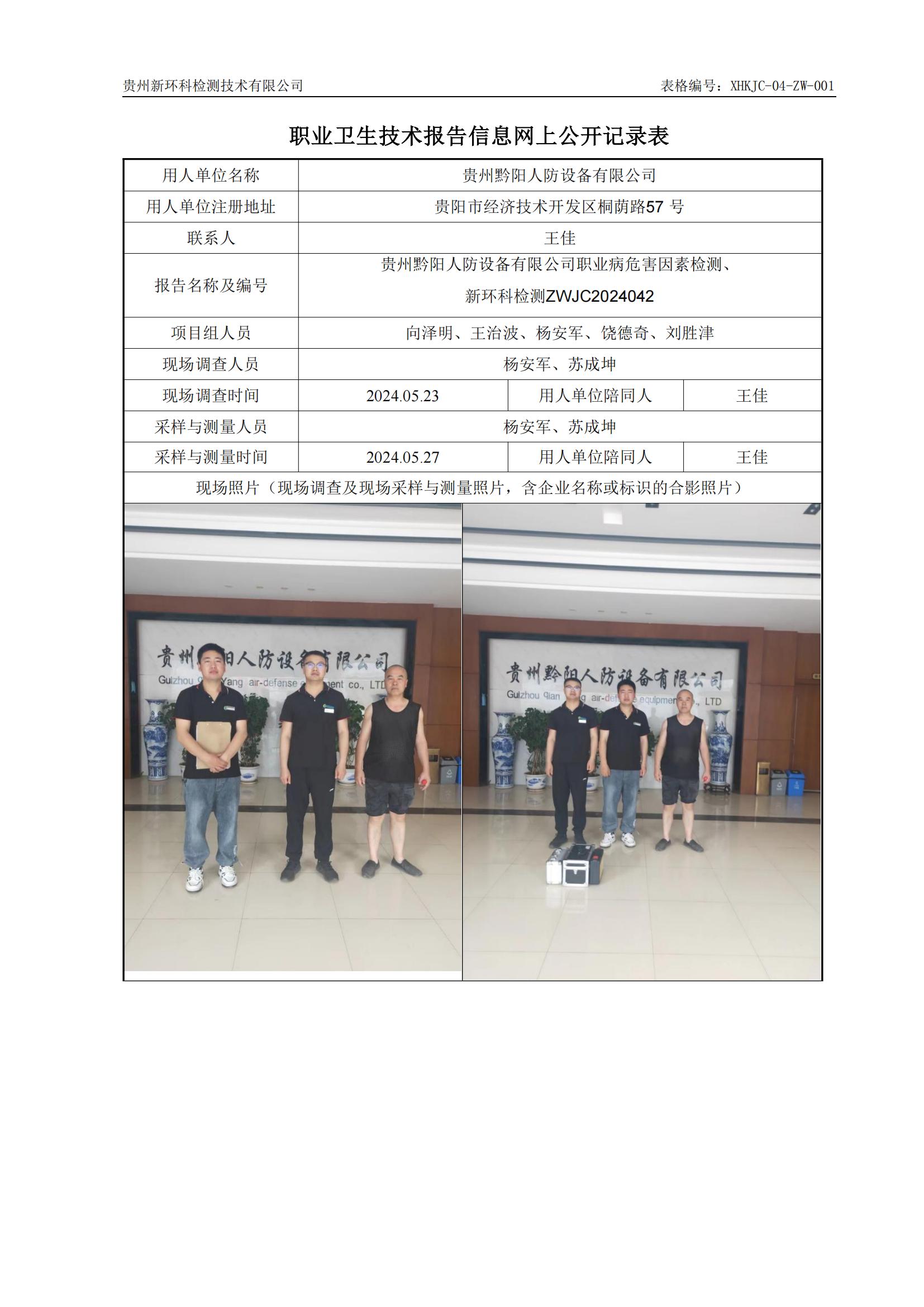 贵州黔阳人防设备有限公司职业病危害因素检测公示