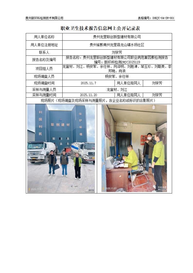 贵州龙里联创新型建材有限公司职业病危害因素检测公示