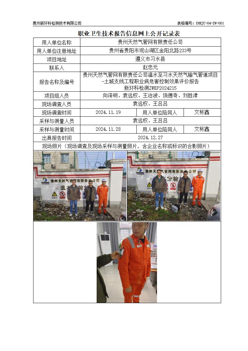 贵州天然气管网有限责任公司温水至习水天然气输气管道项目-土城支线工程职业病危害控制效果评价公示