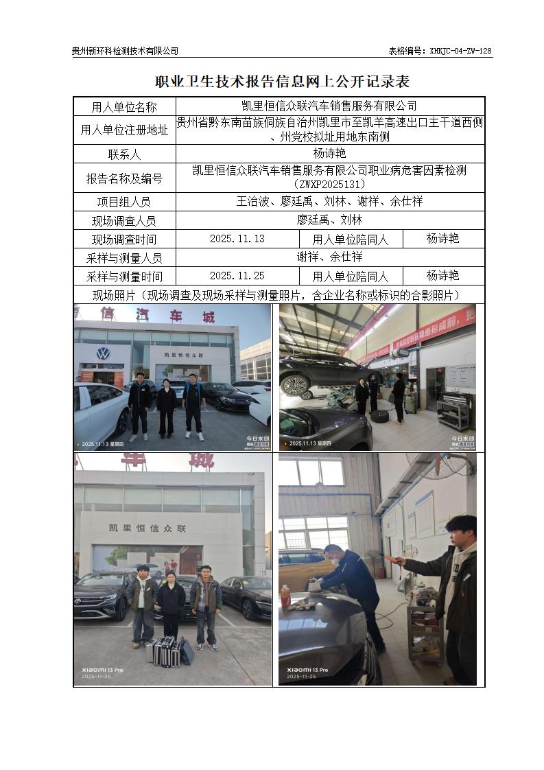 凯里恒信众联汽车销售服务有限公司职业病危害因素检测公示