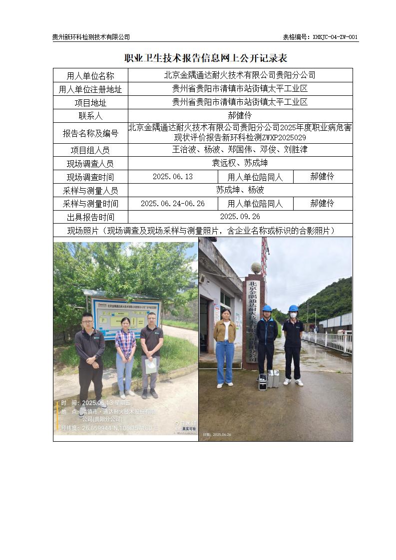 北京金隅通达耐火技术有限公司贵阳分公司2025年度职业病危害现状评价公示