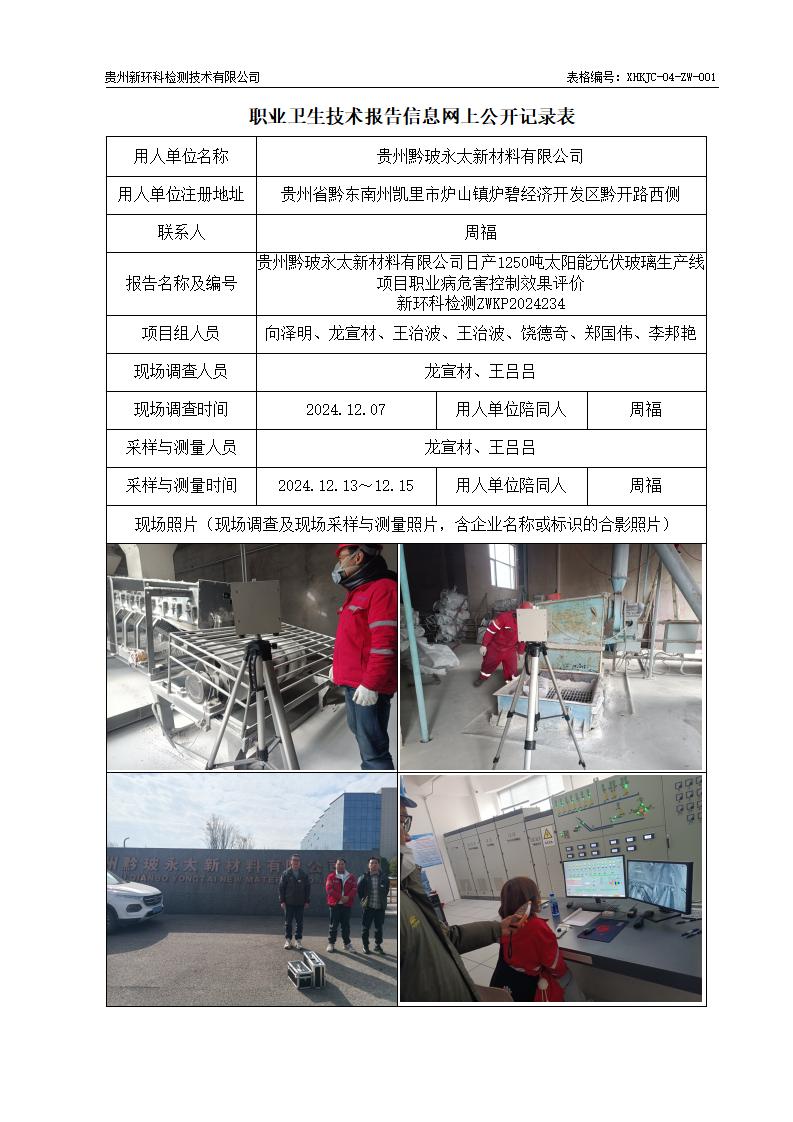 贵州黔玻永太新材料有限公司日产1250吨太阳能光伏玻璃生产线项目职业病危害控制效果评价公示