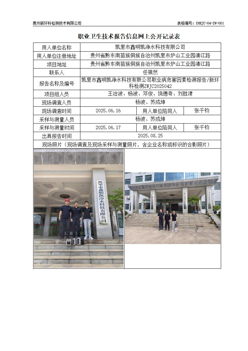 凯里市鑫明凯净水科技有限公司职业病危害因素检测公示