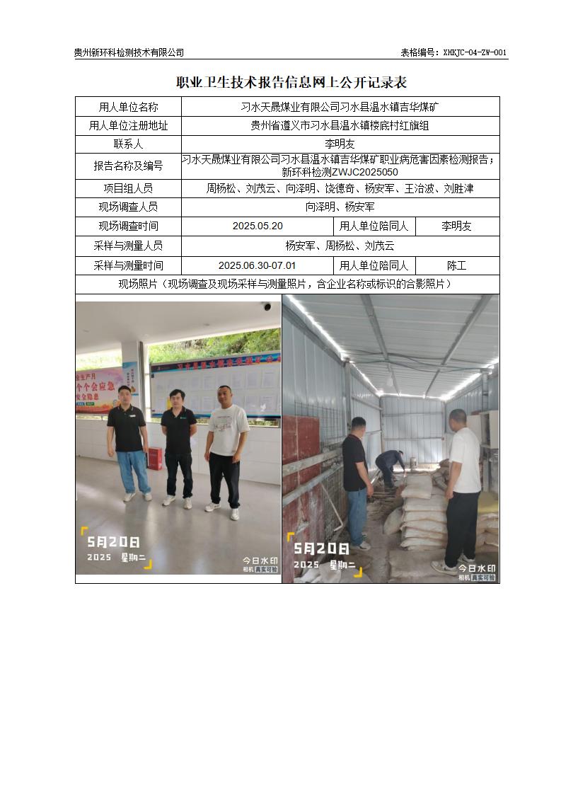习水天晟煤业有限公司习水县温水镇吉华煤矿职业病危害因素检测公示