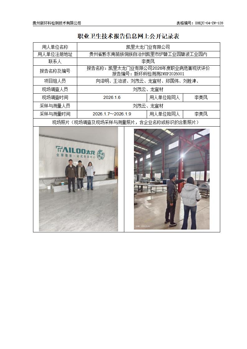凯里太龙门业有限公司2026年度职业病危害现状评价公示